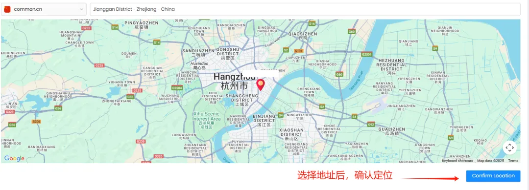 谷歌定位使用拼音,定位到街道即可, 必须从下拉选项里选定地址后,点击确认。
