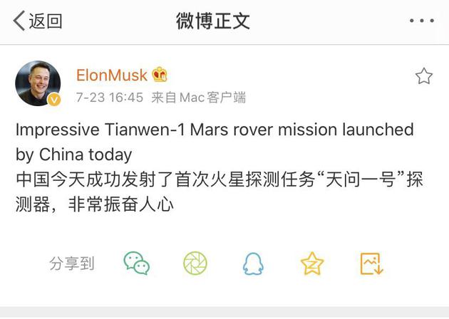 探测器进入预定轨道3个小时后,16时45分,马斯克通过微博祝贺本次发射,"中国今天成功发射了首次火星探测任务 '天问一号'探测器,非常振奋人心。"