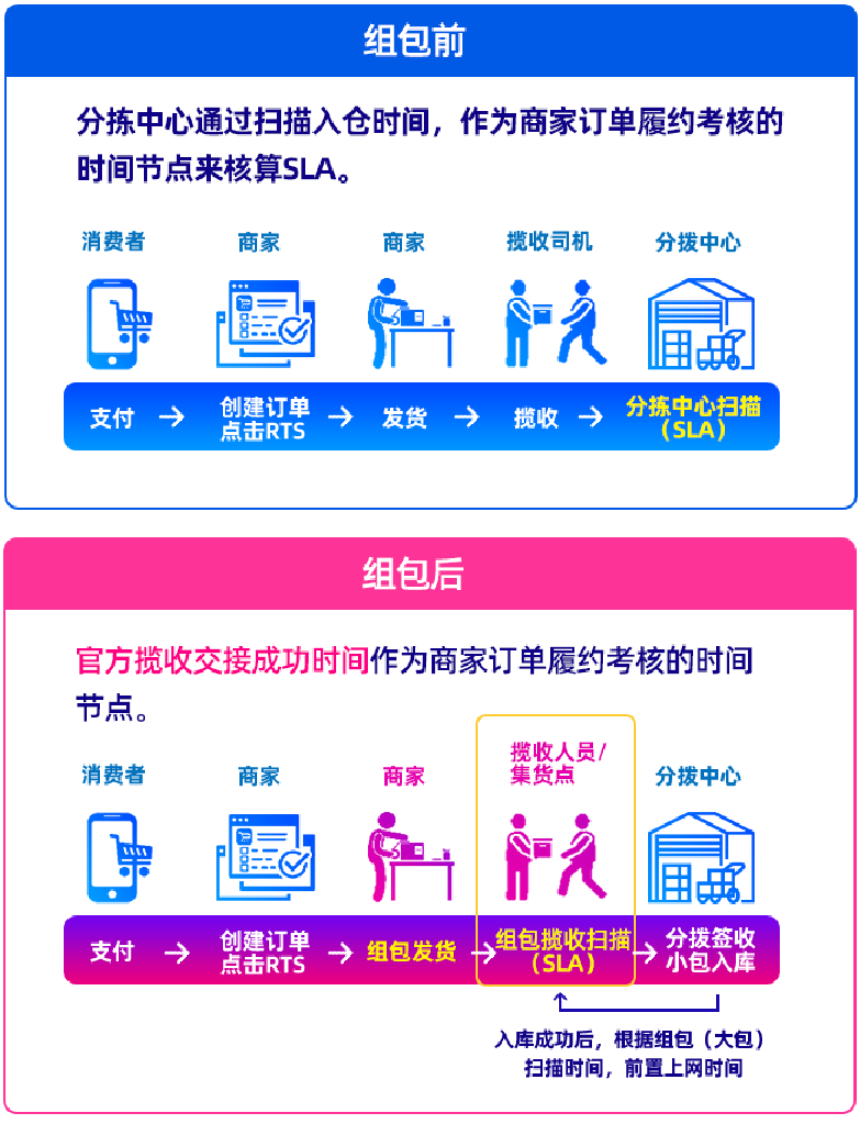 选择这三种官方揽收服务的商家的订单履约时效考核节点将获得极大的优化。将货品系统组包后交付给官方揽收人员或集货点后,即可完成商家履约,商家履约效率直接提升24-48小时。