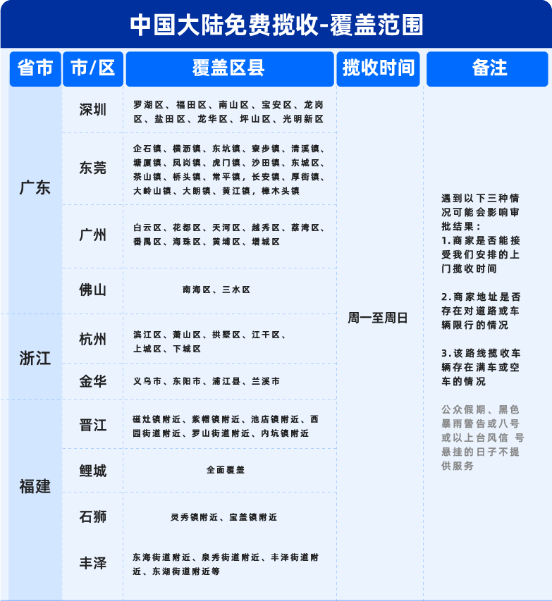 在免费揽收覆盖范围内,商家只需满足最近30天内日均单量大于等于50单的条件,便可享受免费上门揽收服务。为扶持更多小商家,当前可通过多个商家联合申请来达到免费揽收的单量标准,且只需要1名商家代表在系统提出申请即可,操作更加便捷。