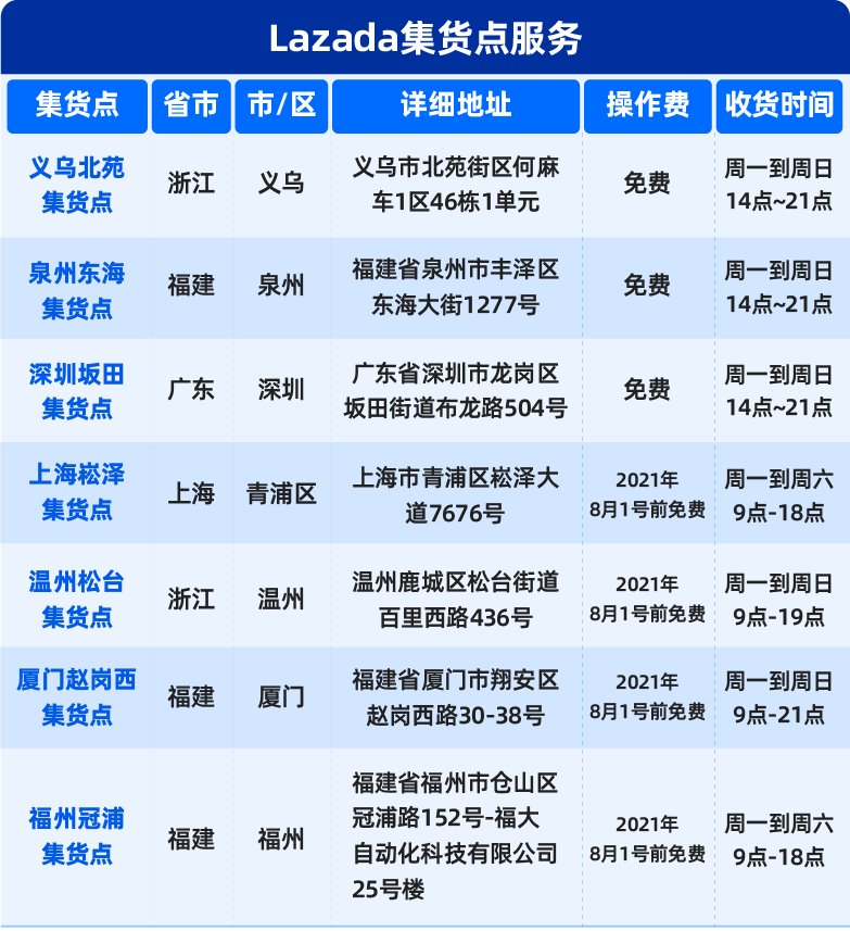 Lazada7城集货点已正式启动了!覆盖了产业带商家集中区域,可能就在你家门口。商家在收货时间内均可自行送货上门,提供高效、便捷且灵活的收货服务。此外在义乌、泉州、深圳集货点,商家可享受操作费用全免的特别福利。