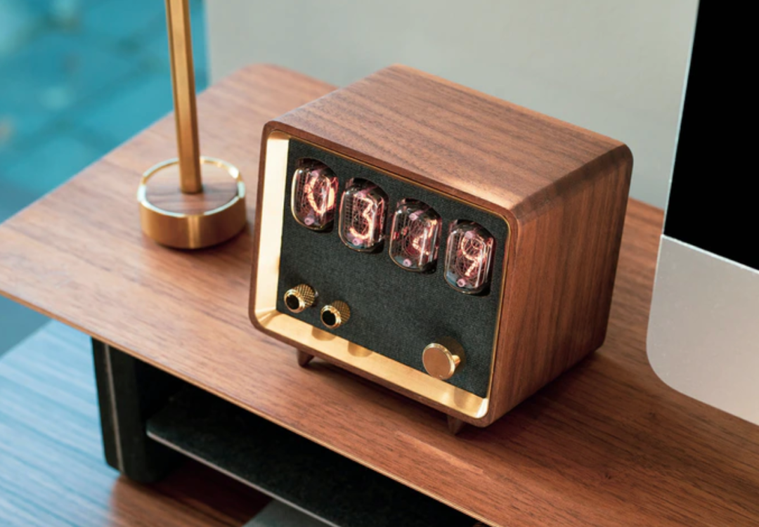 这款蓝牙音箱最大的亮点,也是它最吸引人的地方,是它的精致的外观,尤其是那四根瞬间抓人眼球的漂亮玻璃数码管,简练的旋转按钮,美国胡桃木和黄铜精制的箱体,充满经典复古美学元素。