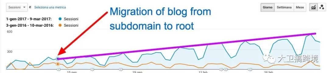 在这里引用semrush的1个效果图,把二级博客域名跳转到blog二级页面后的流量增长