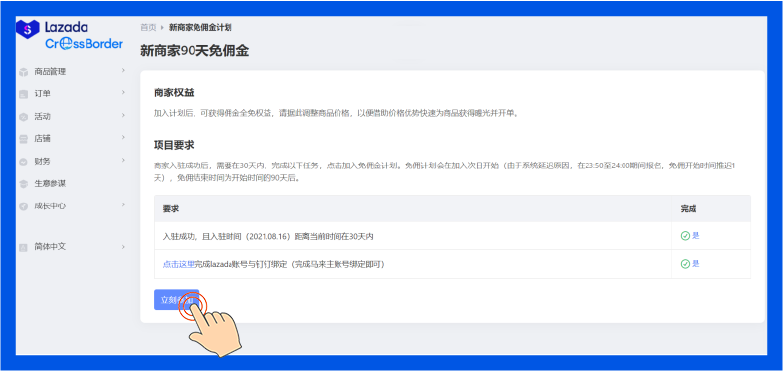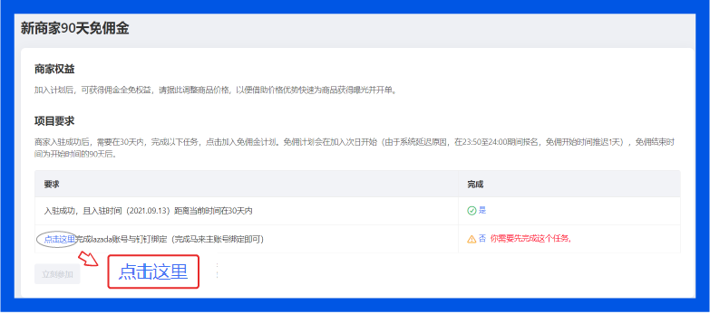点击"立刻参加",即完成了所有的操作。免佣权益会在加入计划的次日开始生效。免佣期内,系统将自动设置商家佣金为0。