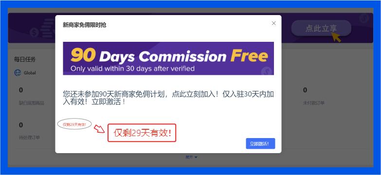 登录GSP站点后,页面会自动跳出"新商家免佣限时抢"弹窗,点击"立即激活"即可跳转申请界面。注意红字倒计时提醒,商家需在账号审核通过日起30天内加入才有效。