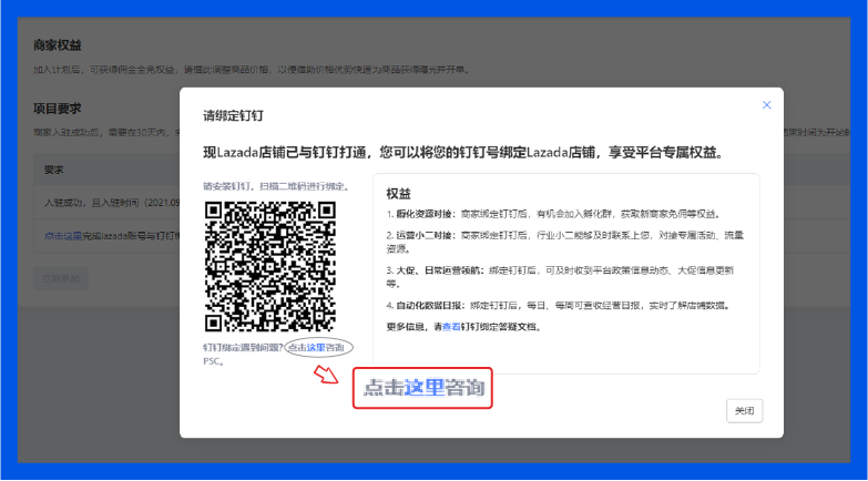 鼠标单击蓝色小字—"点击这里",打开手机钉钉扫码后,即完成钉钉账号绑定Lazada账号。若绑定后页面未自动跳转,请刷新网页后查看完成状态是否改变。
