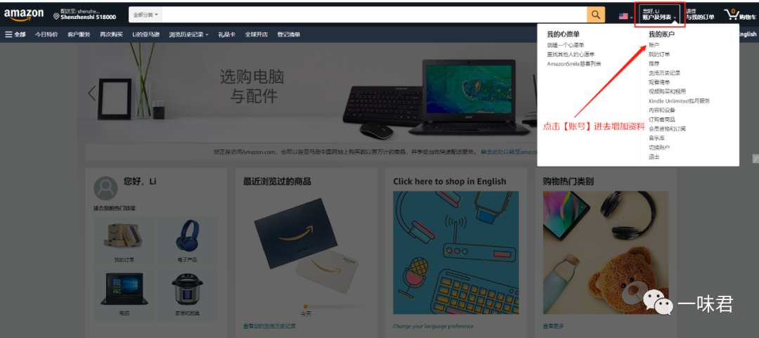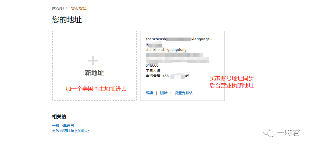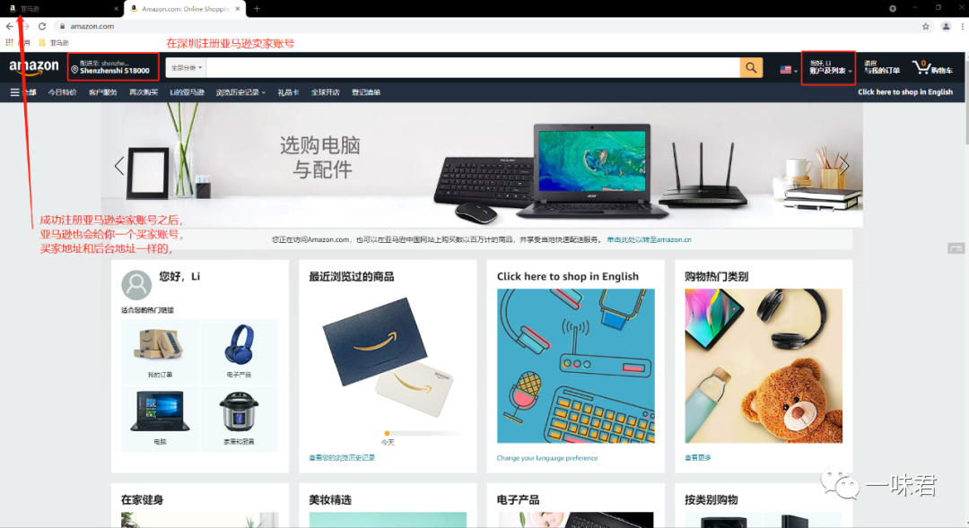 当我们成功注册亚马逊卖家账号之后,亚马逊也会给你一个买家号,资料是绑定卖家资料的,其实我们是卖家也是买家,只不过你可能没有发现和利用而已。在卖家账号同一个浏览器打开www.amazon.com,你的买家账号也出来了,但这个是中国资料的买家号,这个买家号的收货地址绑定营业执照的地址,所以你要下单美国产品,也只能在开通全球配送的Listing下单,要不绝大部分的Listing是没有办法配送到中国。当我们打开www.amazon.com的时候,我们要把配送地址改成美国邮编地址或者美国收货地址才能把网站定位到美国。