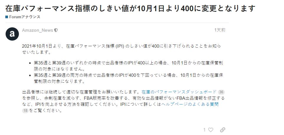 亚马逊称,从 2021 年 10 月 1 日起,库存绩效指标 (IPI) 阈值将降至 400。