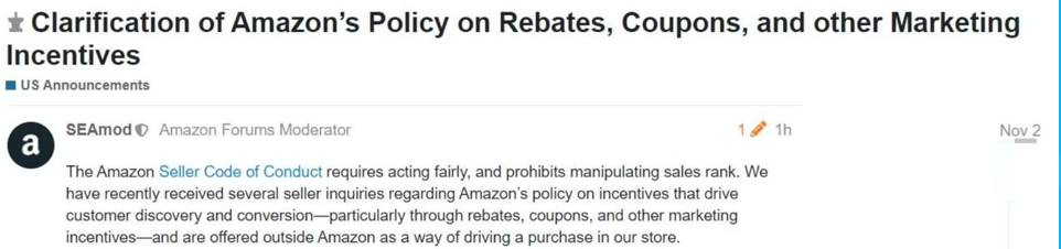 亚马逊论坛管理员表示,最近收到了一些卖家询问,关于推动客户发现和转化的激励政策,特别是通过返款、优惠券和其他市场购物激励的措施等询问。这些都是目前比较常见的亚马逊站外推广手段。