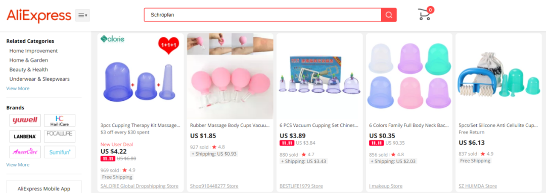 在速卖通搜索"Schröpfen",更是有琳琅满目的拔罐小道具提供给外国人尝鲜。