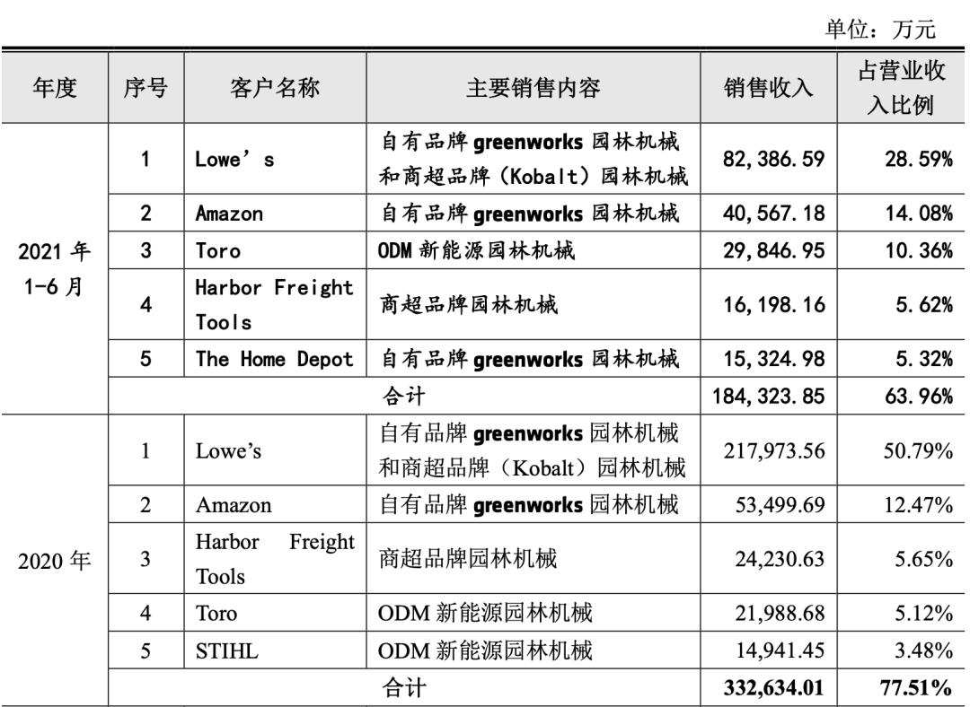 格力博在销售渠道开拓上全面开花,以上三大渠道则是重点发展。2021年上半年,Lowe's、Amazon和The Home Depot,在格力博的销售贡献中分别排名第一、第二和第五。