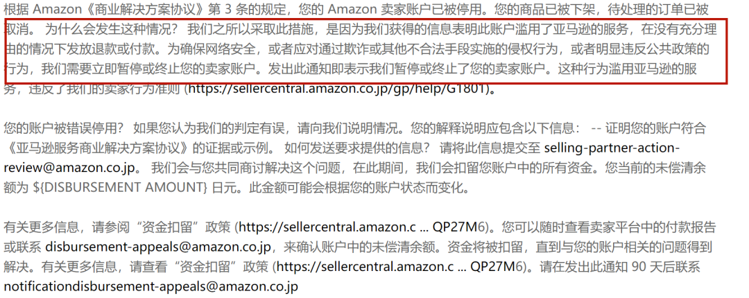 而就在8号早上,该卖家打开后台便收到了亚马逊的封店邮件:我们获得的信息表明此账户滥用了亚马逊的服务,在没有充分理由的情况下发放退款或付款。