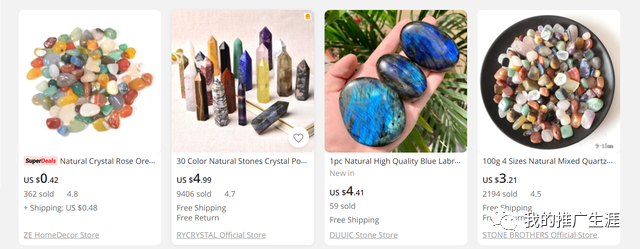 这类的水晶原材料产品,在速卖通上面也有很多,一搜一大把,而且水晶类的产品,可以写文章的地方特别的多,因为老外既对水晶感兴趣,同时又恨迫切的需要学习相关的水晶知识。