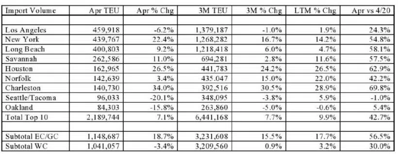 海事专家约翰·麦考恩在《麦考恩报告》中表示:"4月份,美国前10大港口的入港集装箱吞吐量增长7.1%,高于3月份3.5%的增幅,但低于2月份13.7%的增幅。"