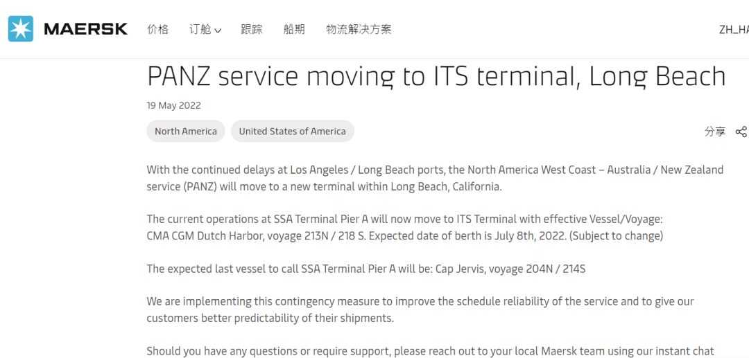 由于洛杉矶/长滩港持续不断的延误,5月19日,马士基宣布将美西-澳新航线的PANZ服务更改到加州长滩港的新码头。