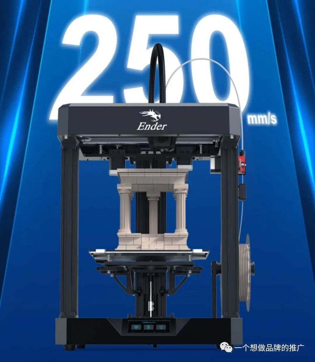Anker 最初的时候宣传的核心卖点是快速打印,速度能到250mm/s,速度快五倍。当然这个速度是跟50mm/s的慢速雕刻机来对比的,这个有一定夸张的成分,毕竟去年创想三维新出的ender 7 3D 打印机主打卖点 250mm/s。
