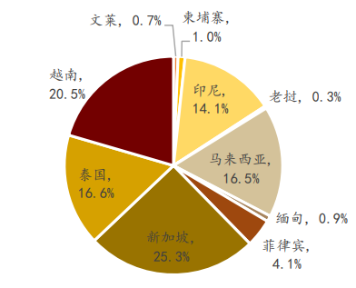 2021 年,东盟 10 国出口总额为 1.64 万亿美元,我国是 3.36 万亿美元,是东盟 2 倍左右。分国家来看,新加坡、越南、泰国、马来西亚、印尼 5 个国家在东盟 10国出口中占比较大,分别为 25.3%、20.5%、16.6%、16.5%、14.1%,4 个国家占东盟出口的 92.9%。2021 年我国有约七成出口和东盟的重合度高,主要为以下 6类:机电产品。占我国出口 43%,占东盟 38%,均为第一大出口类别。其中,新加坡 49%,越南 46.3%,马来西亚 42.3%,泰国 31.8%,印尼7.8%。贱金属及其制品。占我国出口 7.9%,东盟 6.3%。其中,占比最高的印尼13.2%,最低的新加坡 2.4%。化学及其制品。占我国出口 6.4%,东盟 6.2%。其中,占比最高的新加坡 11%,最低的越南 1.8%。车船飞机等交运设备。占我国出口 5.2%,东盟 3.8%.............