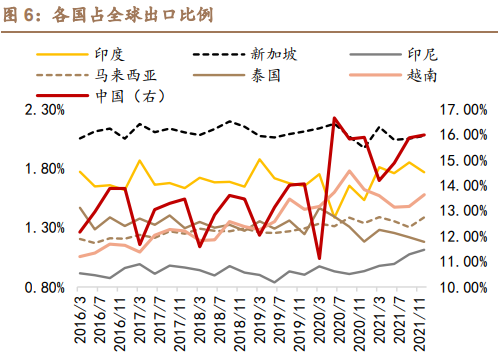 疫情发生以来的两年里,我国和东南亚有两次疫情停工带来的出口订单转移,一是 2020 年一季度,我国部分出口转向东南亚,二是 2021 年三季度,东南亚部分出口转到我国。