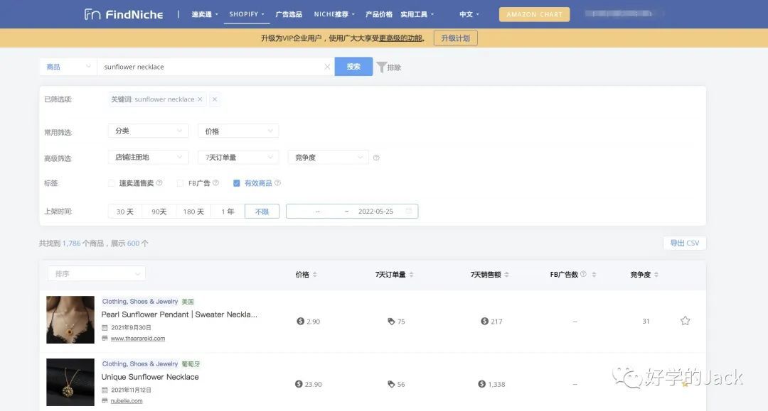 在观察到这个广告在Facebook上互动数据不错之后,我们在选品工具FindNiche搜索同类商品的售卖情况和竞争难度,发现同类商品订单量呈上升趋势,再从中挑选了竞争度较低的,在所有太阳花的项链品相中最后锁定了这一款。
