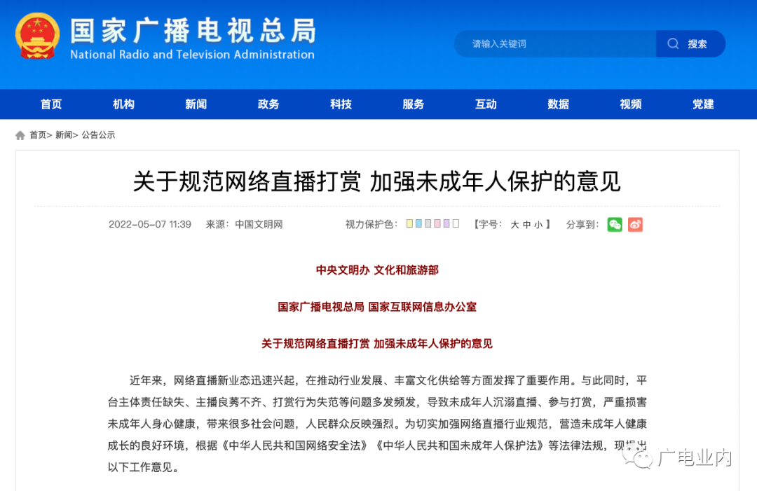 5月7日,中央文明办、文化和旅游部、国家广播电视总局、国家互联网信息办公室等四部门发布《关于规范网络直播打赏 加强未成年人保护的意见》。