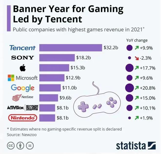 2021年在全球上市公司的游戏营收中,苹果排名第三,仅次于索尼,超过了微软。NewZoo的分析师称,苹果在2021年全年的游戏总收入估计为153亿美元,同比增长了17.7%。