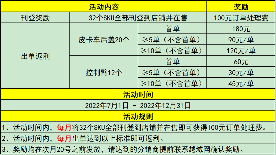 另外,越域网为大家设置了以下3个刊登奖励和出单返利活动,以月为单位,持续到12月底。每月完成活动内容的分销商均有奖。