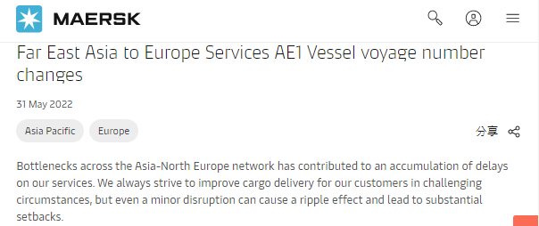 马士基表示,鹿特丹和不莱梅港目前"拥堵最为严重,造成泊位等待时间"大幅延长"和船舶工作效率缓慢。由于亚洲-北欧服务网络的瓶颈导致出现延误,马士基已对AE1航次做出调整。