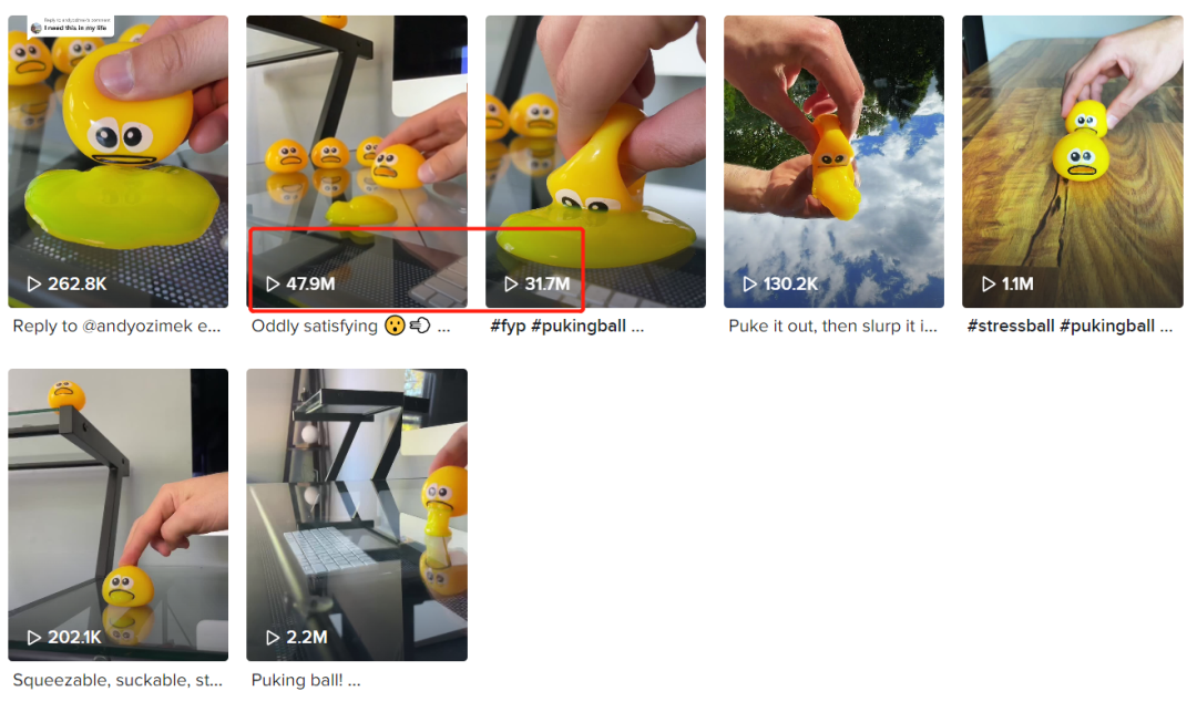 呕吐球的标签#Puking Ball在TikTok上获得4500万播放,不少带货博主在标签下宣传,发布解压视频。通过观察,大家的拍摄手法比较相似。