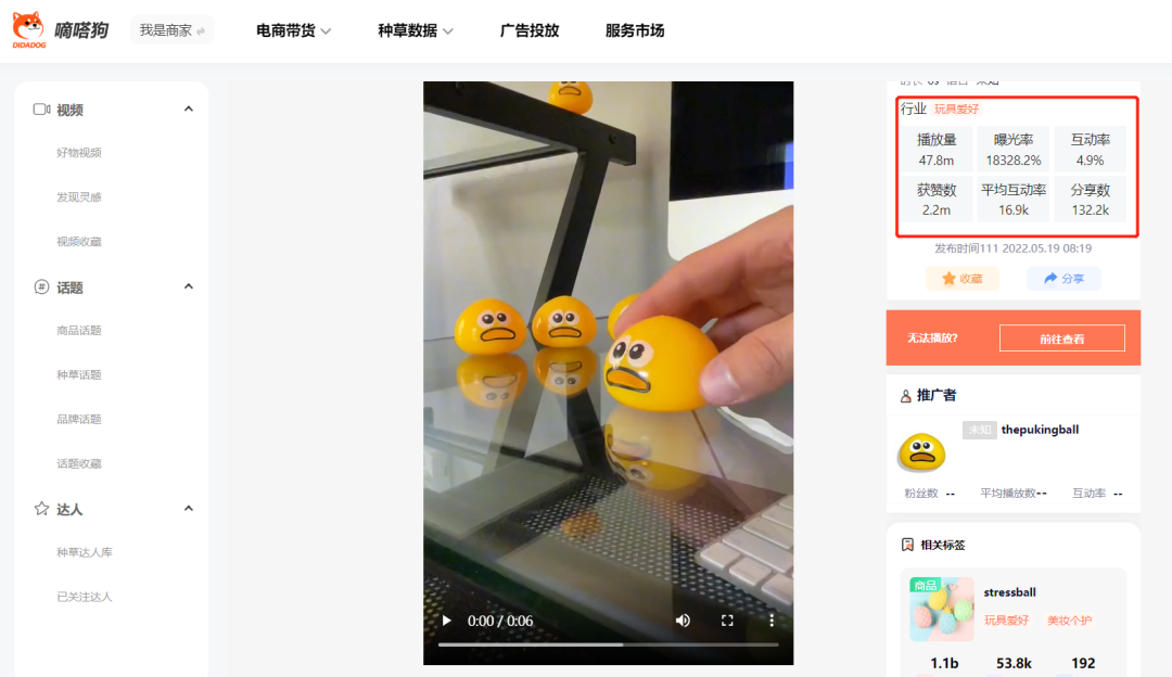 根据嘀嗒狗数据显示,这条热门视频在5-19发布,该视频获得了4780万播放,获得220万点赞,评论达到了1.6万,分享数超过13万条,曝光率达到了18328.2%。