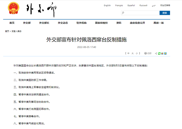 针对美国国会众议长佩洛西不顾中方强烈反对和严正交涉,执意窜访中国台湾地区,外交部8月5日宣布采取以下反制措施: