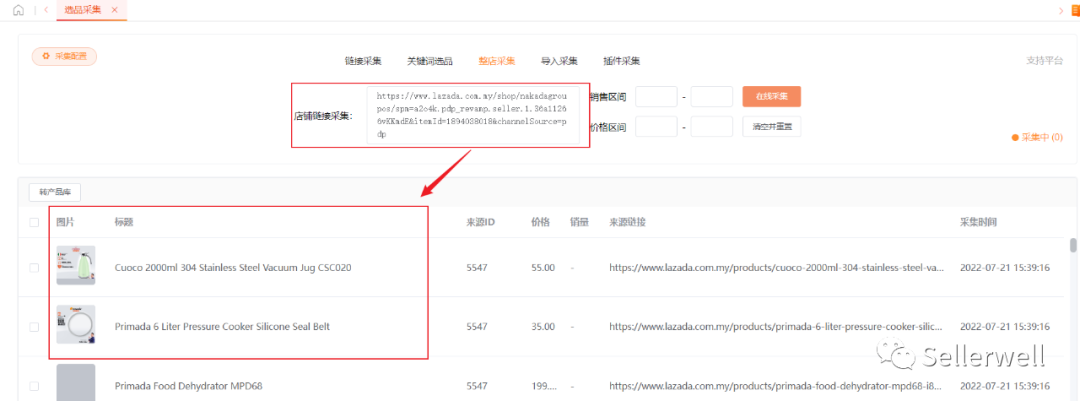 01整店采集输入Shopee、Lazada等店铺首页链接,点击在线采集,即可一键搬家其商品数据至erp系统,随即同步至自己店铺前台。