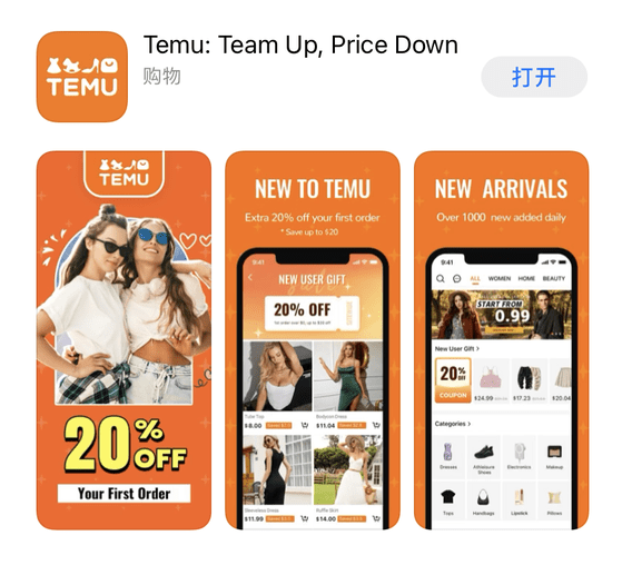 9月1日,拼多多的跨境电商平台Temu已正式在海外上线,其应用下载介绍显示"Team Up,Price Down",意味买的人越多,价格越低。显然是主打性价比路线,但是对于拼单、免单和砍一刀等玩法并未沿袭过来。