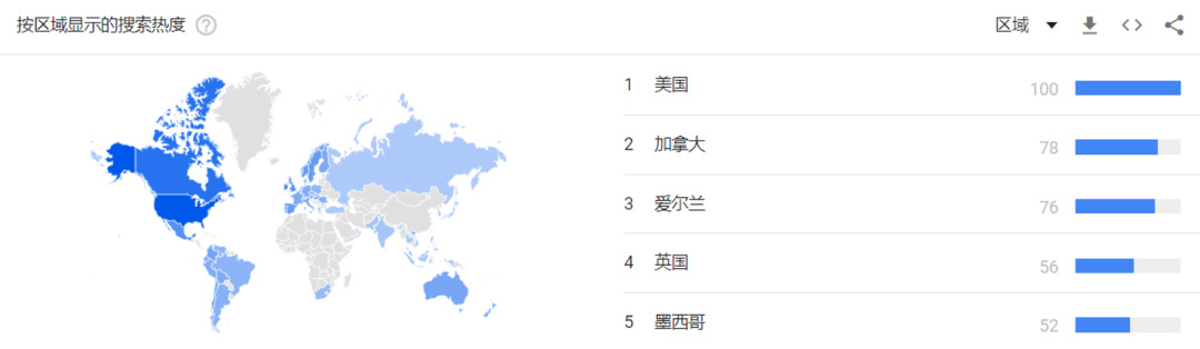 从搜索热度来看,通过 Google Trends 可以发现,去年万圣节前夕对于Halloween搜索热度最高的几个国家分别为美国、加拿大、挪威、葡萄牙、墨西哥。