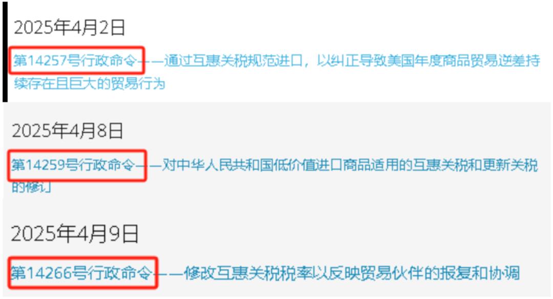通知里提到的美国第14257号行政令、第14259号行政令、第14266号行政令,就是我们熟悉的美国对等关税政策。