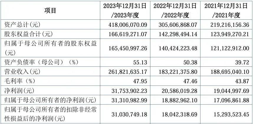 招股说明书显示,2021-2023年,思锐光学营业收入分别为 1.89亿元、 1.83亿元、2.62亿元,归属净利分别为1709.69万元、1888.3万元、3131.1万元。