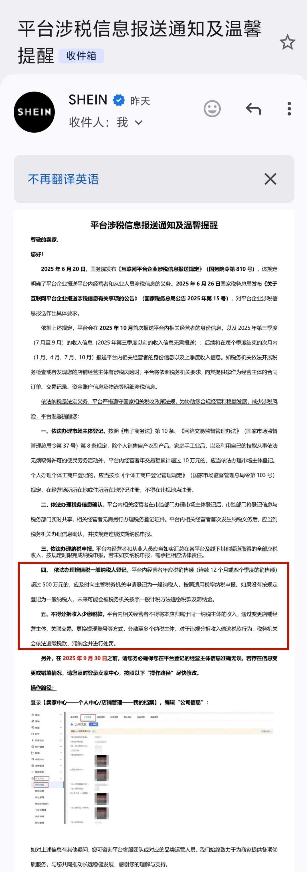 先是SHEIN平台发送"平台涉税信息报送通知及温馨提醒"