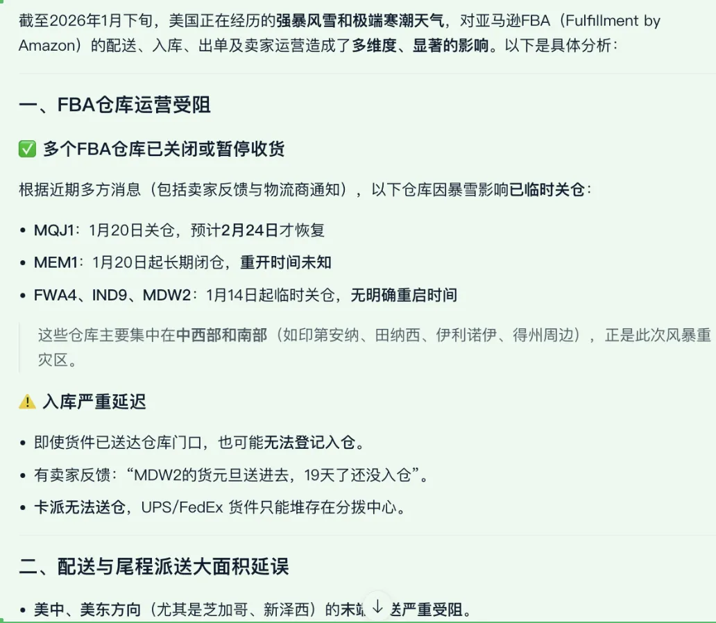美国这次的暴风雪,预计1月底结束但已经造成MQJ1、MEM1、 WA4、IND9、MDW2这些FBA仓库暂停运了肯定会影响FBA订单派送时效